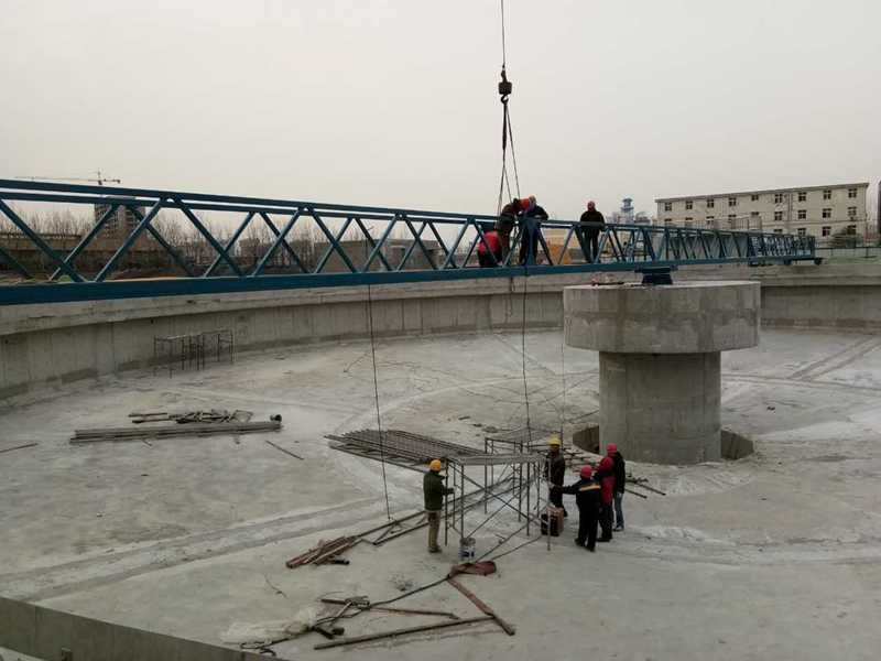 吸泥口,輸泥槽、虹吸管、中心泥罐、中心排泥管排至污泥坑。每個吸泥管上端設有調節器,以調節各吸泥管的流量分配。同時,液面上的浮渣向隨主梁旋轉的撇渣板和周邊浮渣擋板形成的漸縮區域內集中,直至其封閉邊—刮渣擺臂。由擺臂上的刮渣板刮集至集渣斗排出池外。