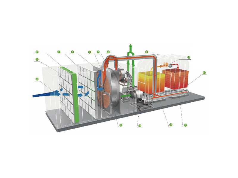經(jīng)預(yù)處理(去除粉塵、顆粒物)后的有機(jī)廢氣流過濃縮轉(zhuǎn)輪時(shí),其中的有機(jī)物在轉(zhuǎn)輪吸附區(qū)域會(huì)被吸附下來,經(jīng)過吸附凈化后的廢氣(約占處理風(fēng)量的85% 95%)排放到大氣中,一小部分廢氣(約占處理風(fēng)量的5% 15%)對(duì)轉(zhuǎn)輪冷卻區(qū)降溫后經(jīng)換熱器被加熱到180 220℃的脫附溫度后,流入脫附區(qū),脫附區(qū)有機(jī)物從吸附劑一沸石上脫離到加熱的氣流中,轉(zhuǎn)輪得以再生,脫附后的高濃度VOCs被送入RTO高溫焚燒。反應(yīng)后的高溫?zé)煔膺M(jìn)入規(guī)整蜂窩陶瓷蓄熱體,95%的熱量被蓄熱體吸收井“儲(chǔ)存”起來,溫度降低到接近RTO入口溫度。蓄熱體溫度升高后,通過切換閥或旋轉(zhuǎn)裝置切換氣流流向,分別進(jìn)行蓄熱和放熱,實(shí)現(xiàn)熱量的有效回收利用。